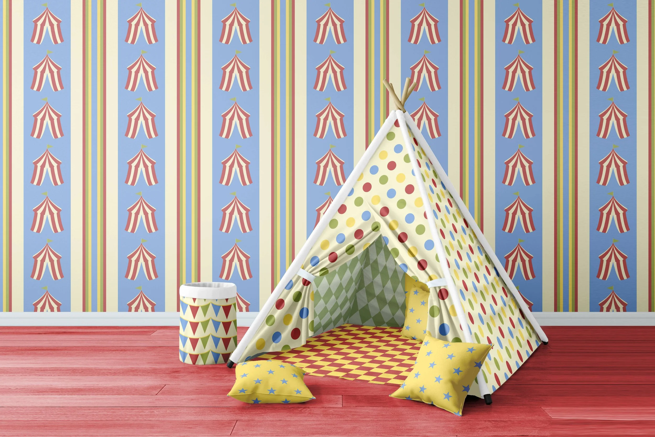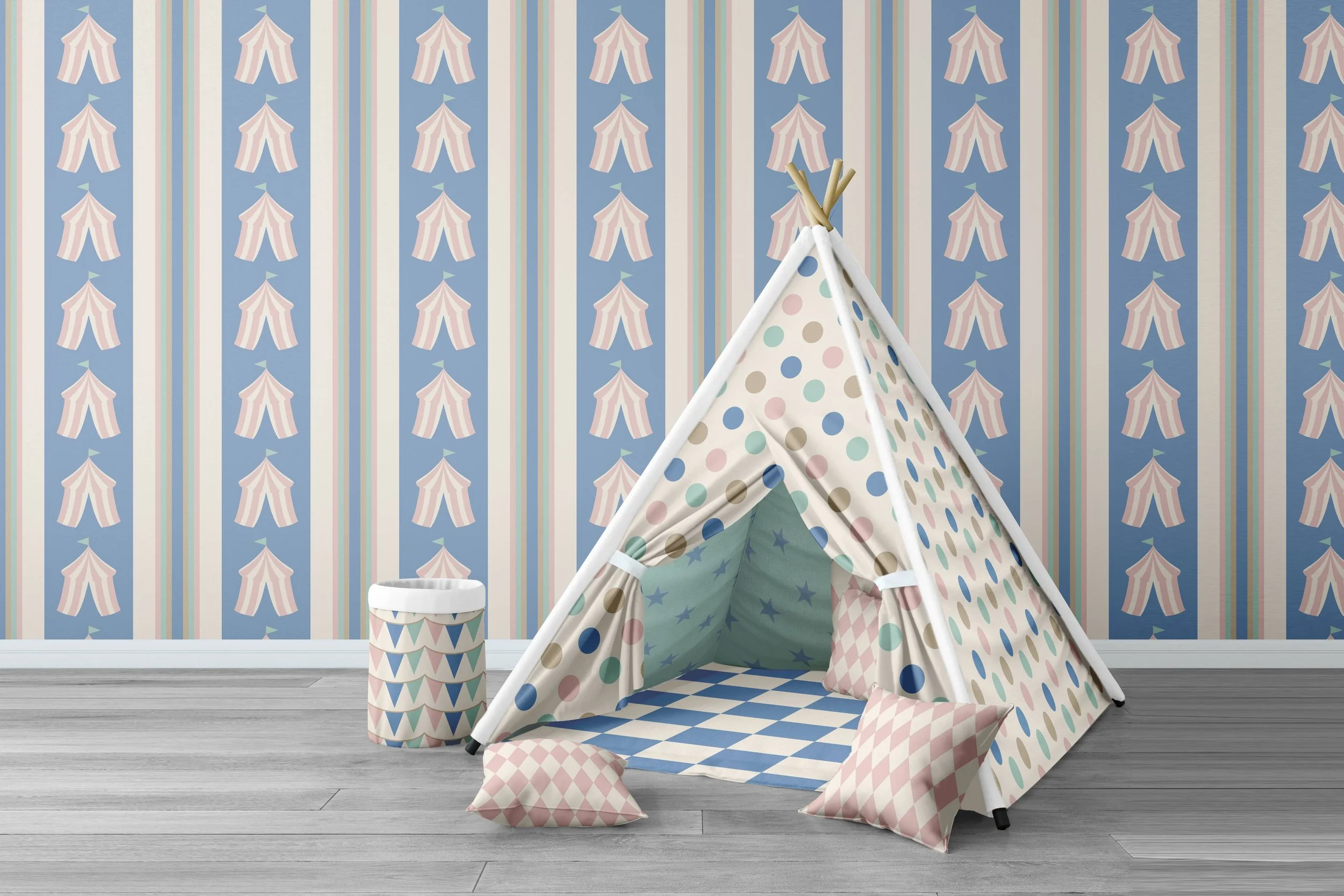 "All the Fun of the Circus" brings a joyful circus‑themed nostalgia to life through playful motifs including big‑top tents, bold geometric shapes, whimsical dots, and festive pennant details. Designed with a rhythmic, child‑friendly layout, it captures the magic of classic carnival imagery—perfect for creating imaginative nursery and toddler spaces that feel fun, energetic, and story‑driven.