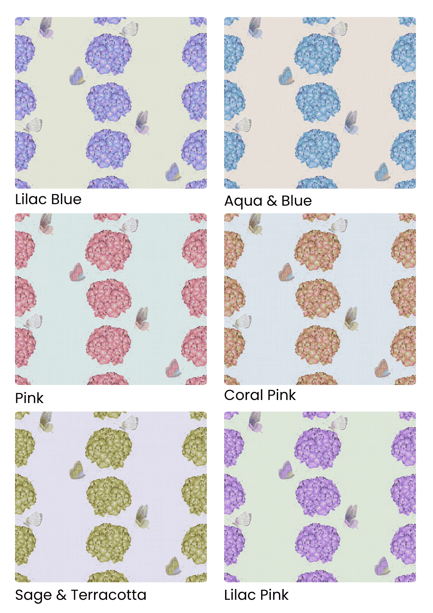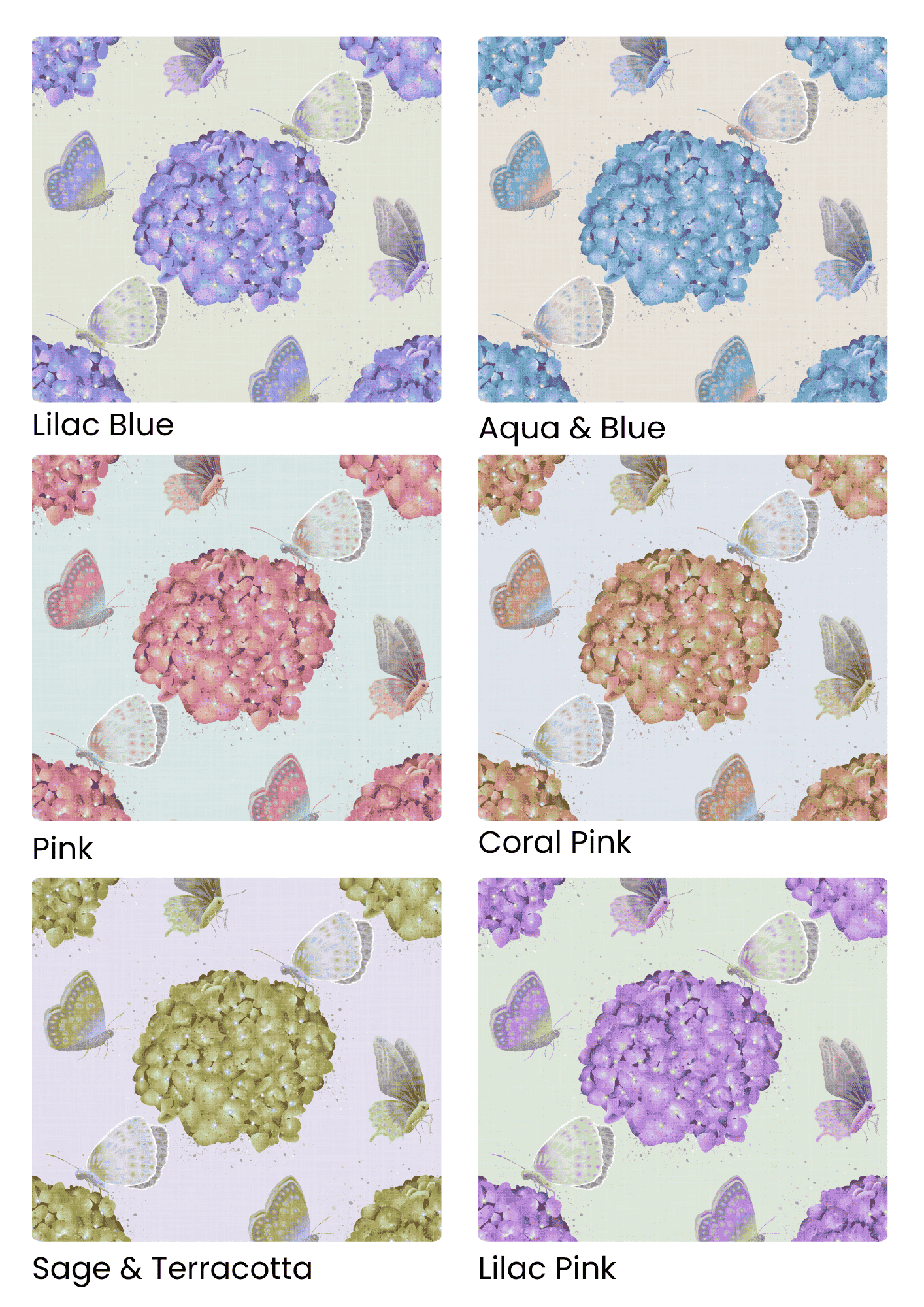 Perfect for spring-inspired styling, butterfly-themed nursery projects, and hydrangea lovers seeking timeless floral prints.