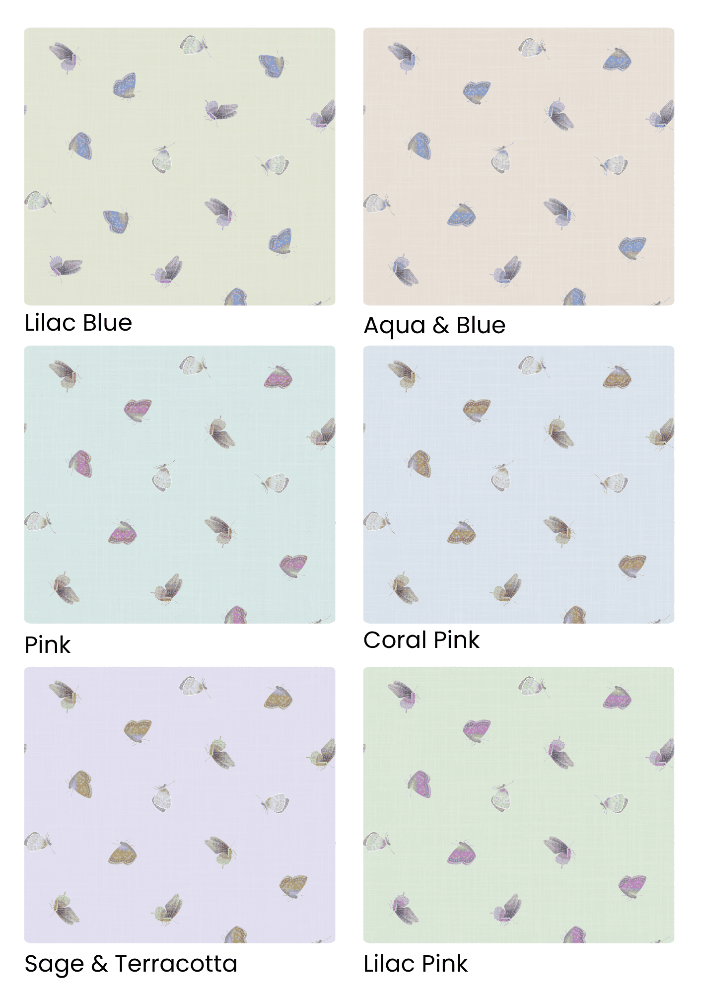 The collection includes two hero patterns and a coordinating tossed butterfly print, offered in six colorways and three scale variations. Designed for seamless use across bedding, curtains, wallpaper, and quilting fabric, each motif balances botanical beauty with whimsical charm.