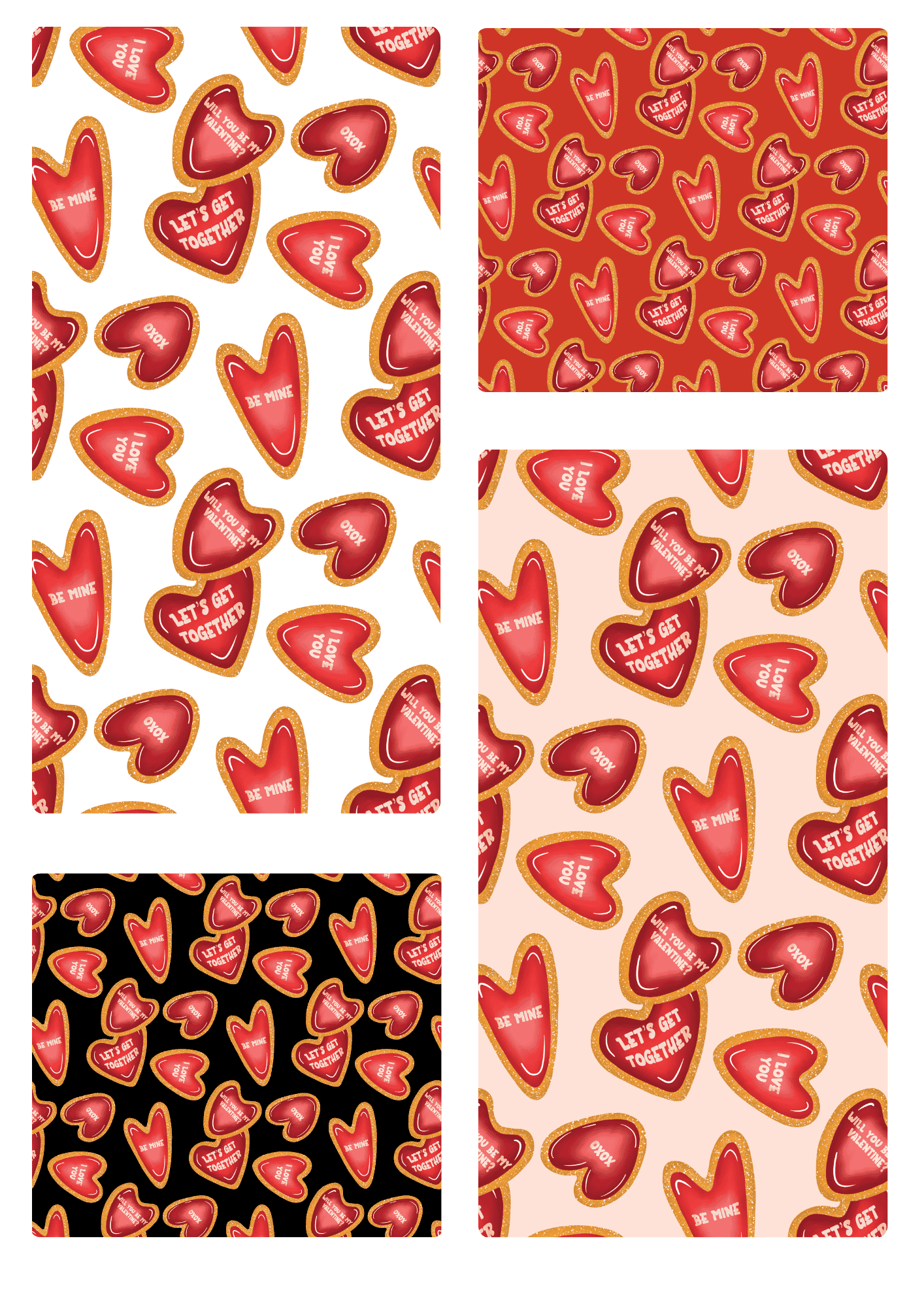 This playful design features heart-shaped cookies iced with sweet phrases like “Be Mine” and “XOXO”. Perfect for Valentine’s-themed fabric, wrapping paper and giftware items.