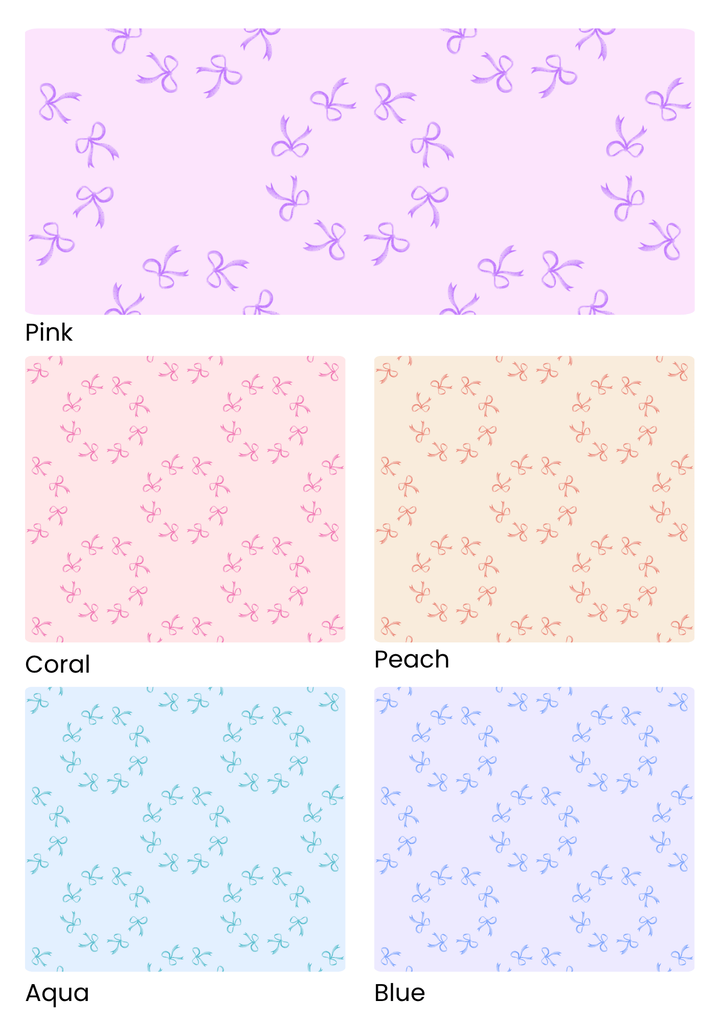 "Coquette Circles" is a charming and elegant design showcasing delicate bows arranged in a circular pattern. It comes in five beautiful color options and three scales.