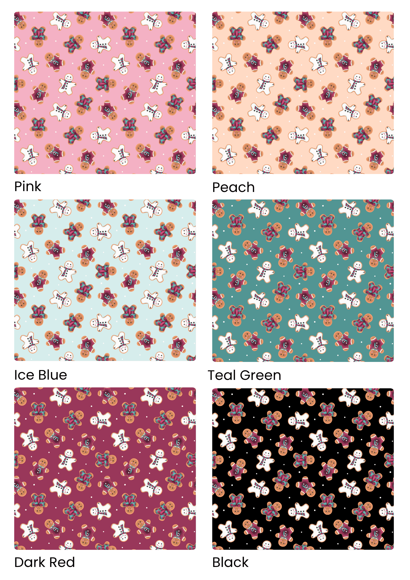 "Gingerbread Jive" is a cheerful seasonal design featuring gingerbread men cookies decorated with icing as Santa, snowmen, and Christmas presents. Offered in six colorways, it's ideal for holiday decor, gift wrapping, crafting, quilting and sewing projects.