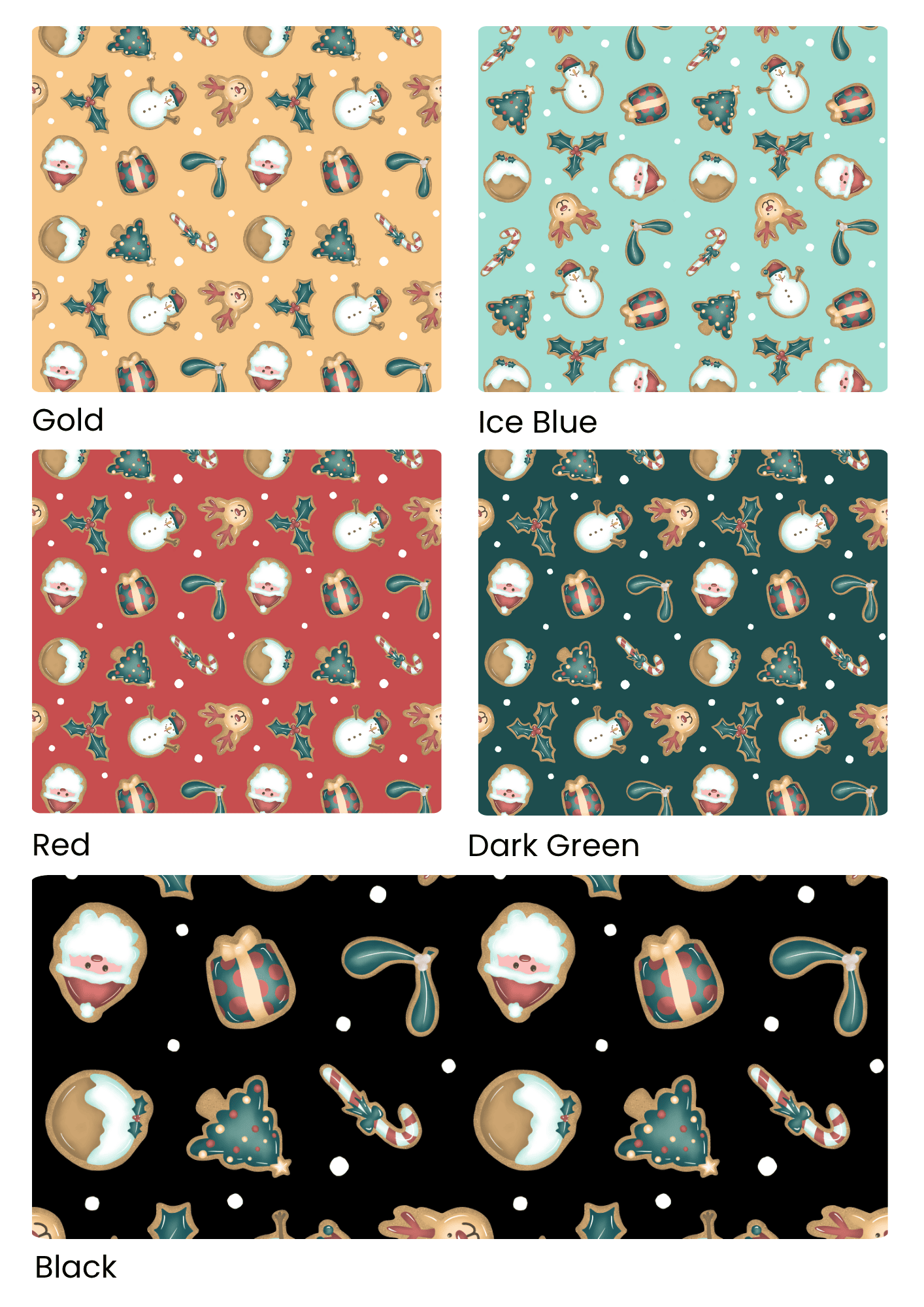 "Gingerbread Joy" is a cheerful seasonal design featuring gingerbread men cookies decorated with icing as Santa, snowmen, and Christmas presents. Offered in five colorways, it's ideal for holiday decor, gift wrapping, crafting, quilting and sewing projects.