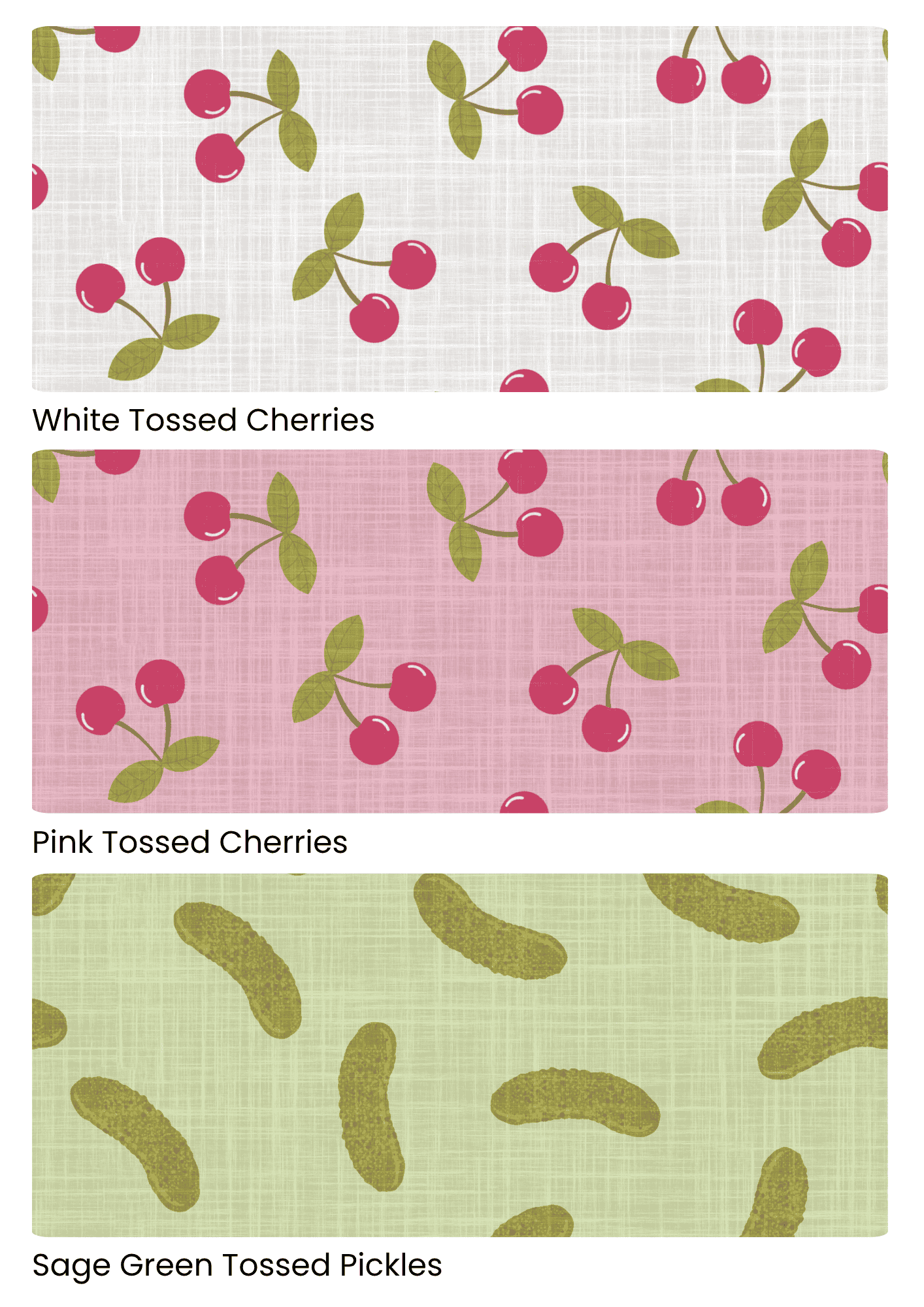 The collection also features matching ginghams without food motifs, coordinating solids, and a variety of tossed food motif designs.