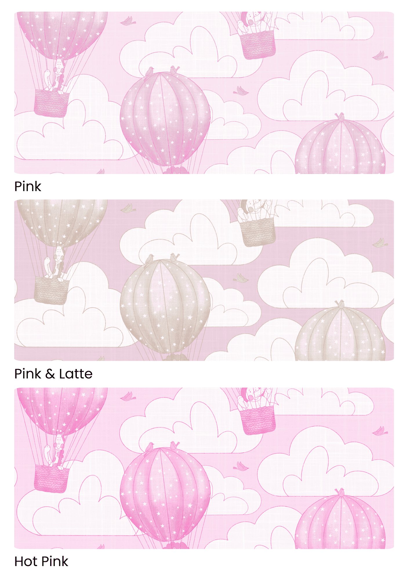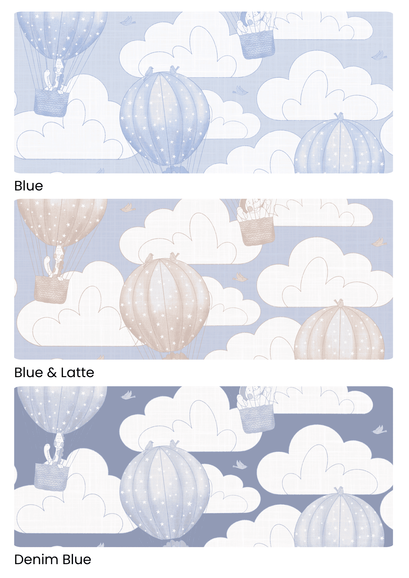“Hot Air Balloon Safari” is a playful and whimsical nursery décor collection featuring giraffes, zebras, elephants, and lions floating gently in hot air balloons. Surrounded by fluffy clouds and cheerful little birds, this hand-illustrated design brings a sense of adventure and gentle movement to safari-themed baby rooms and toddler spaces.
