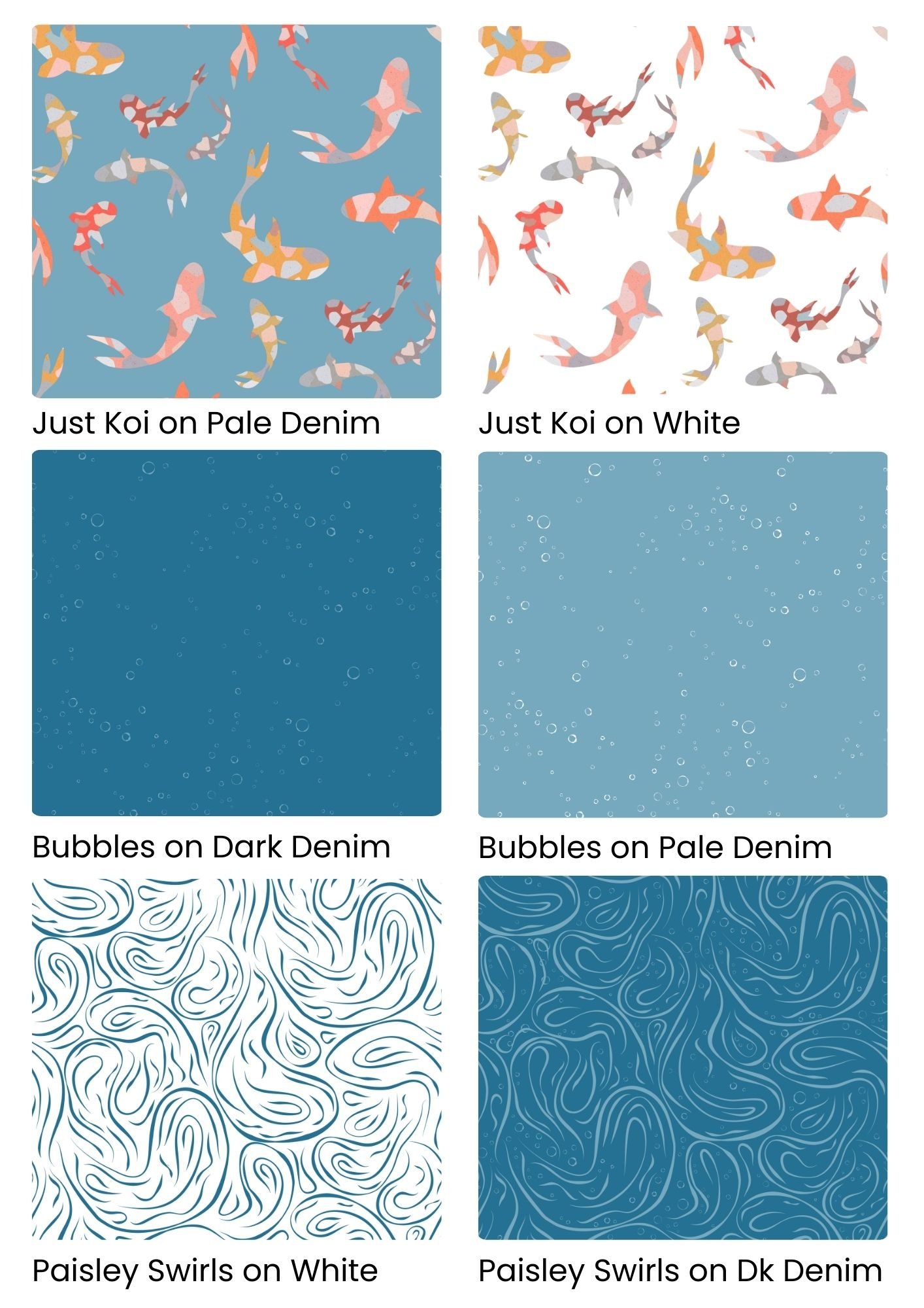 "Koi Paisley" features stylised koi fish creating paisley-shaped ripples in the water. Perfect for fabric, wallpaper, and home décor, the motifs bring a calm, artistic touch to projects ranging from apparel and quilting to interior accents.