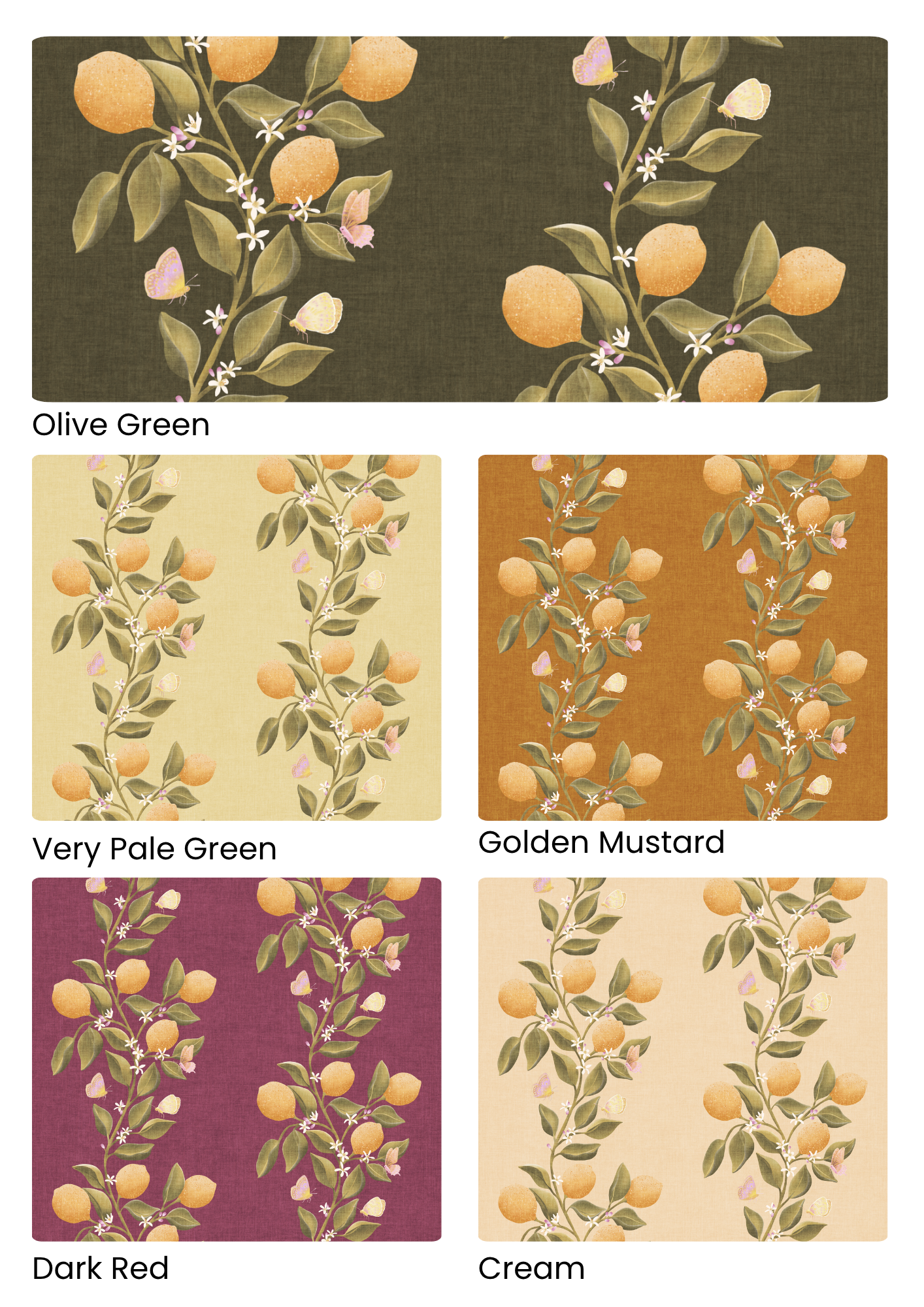 “Lemon Tree Garden” is a vibrant botanical textile and wallpaper collection inspired by espaliered citrus orchards, fluttering butterflies, and spring blossoms. Tapestry-textured and rich in detail, this series evokes cottage garden charm with a modern twist—perfect for nursery décor, kitchen textiles, and garden-inspired interiors.