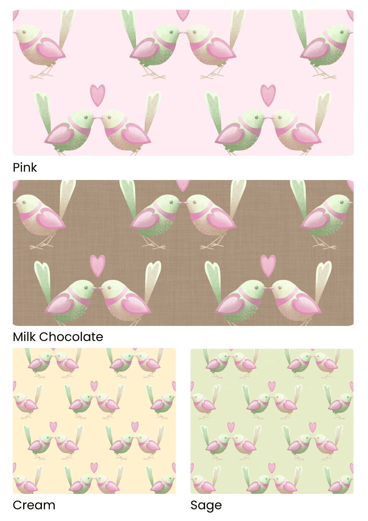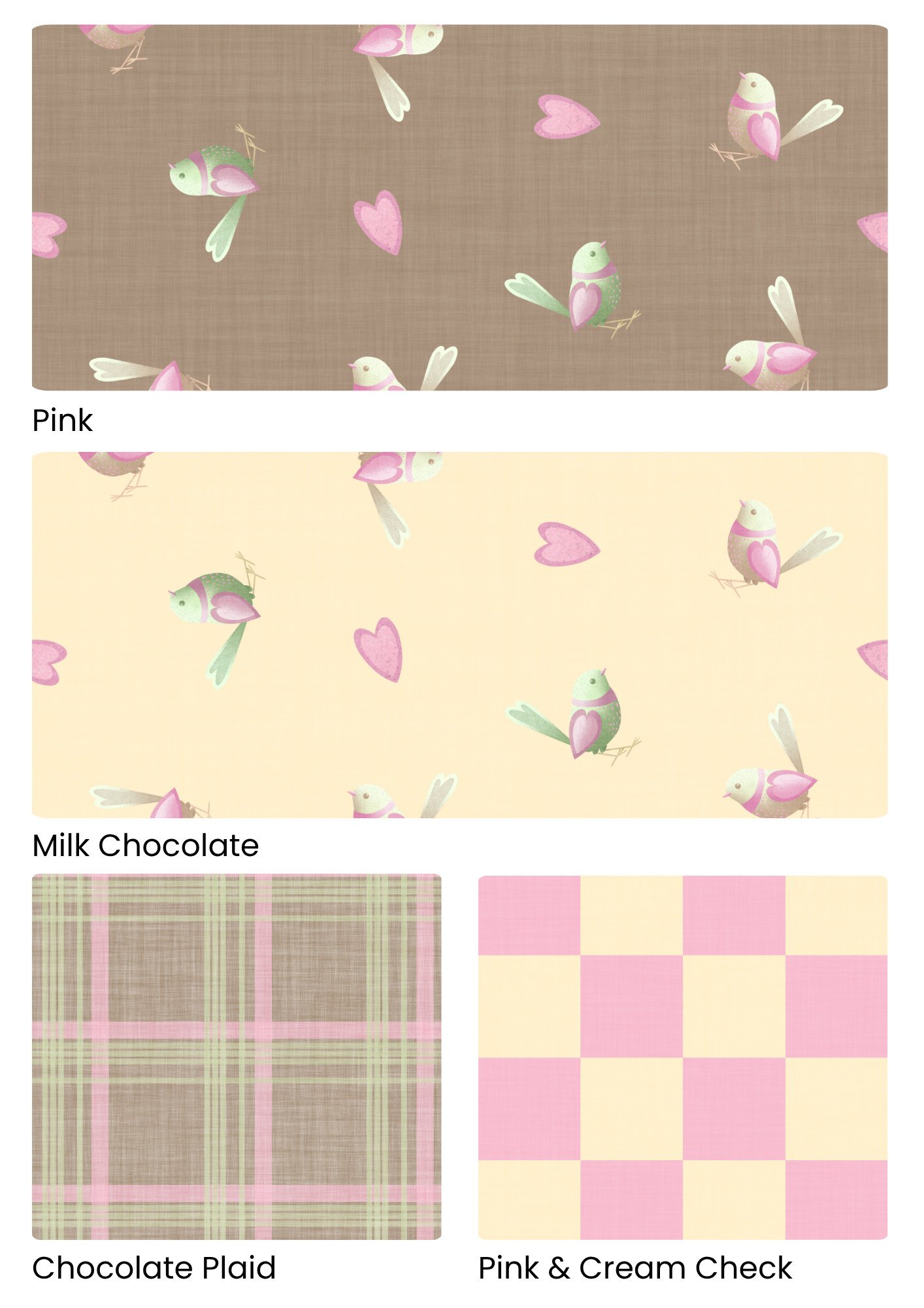 A cheerful blend of birds, hearts, and soft pastels created for Valentine’s Day and beyond. This collection is perfect for nursery decor, kids’ clothing, gift wrap, and seasonal home accents. Charming, understated, and effortlessly versatile, with coordinating designs.