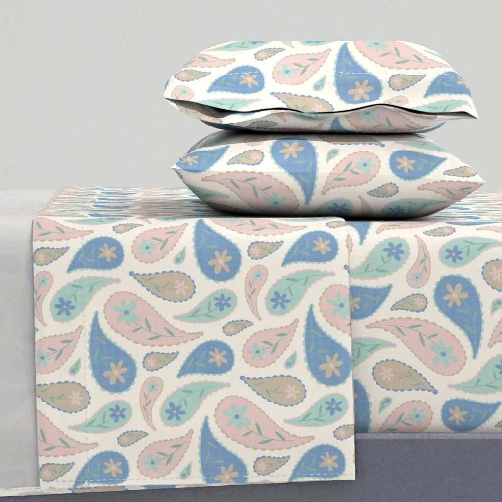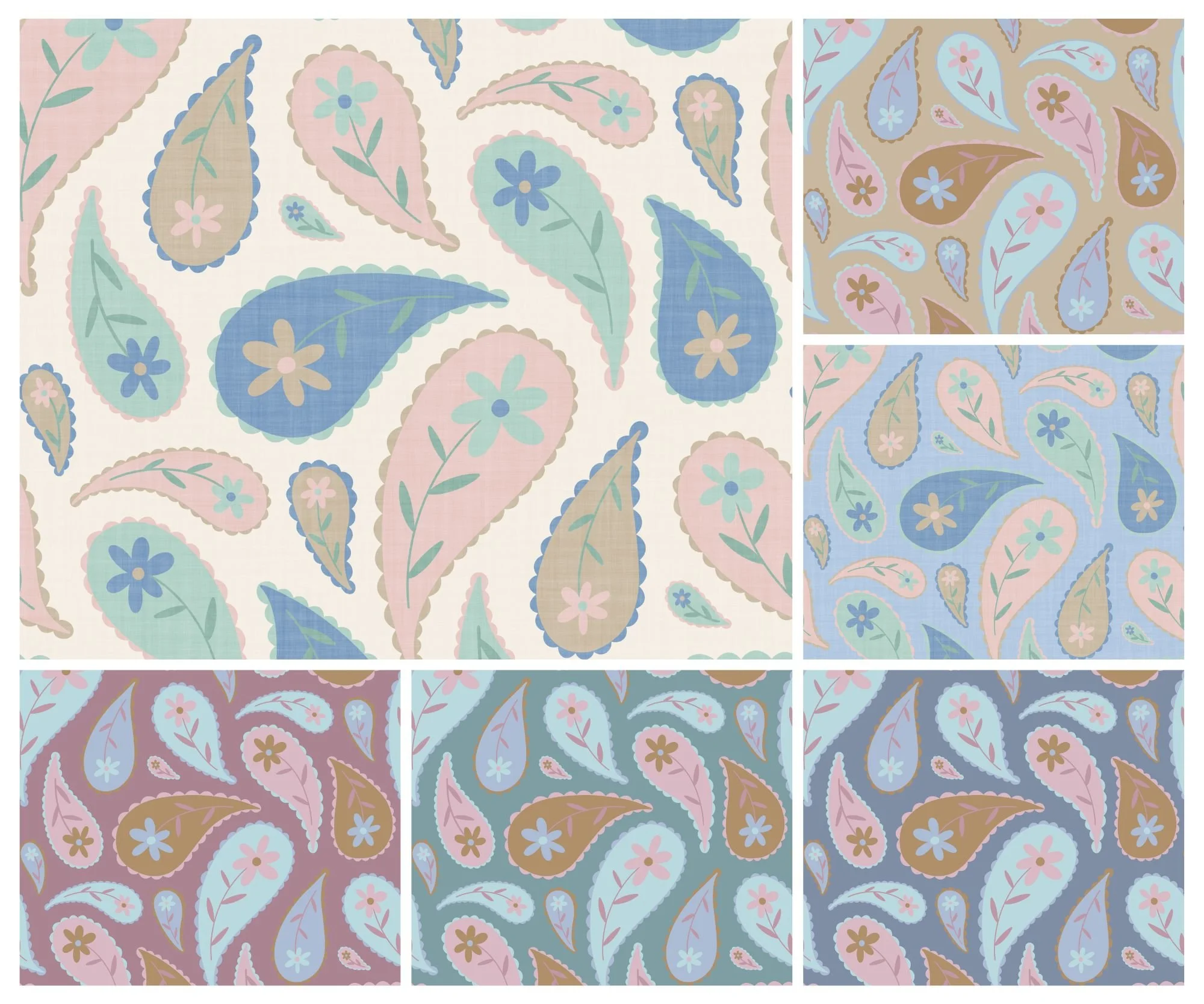 Paisley Daisy is a soft, joyful collection that blends classic paisley curves with delicate daisy florals, creating a fresh take on a timeless motif. Each design is hand‑drawn and thoughtfully colored in a palette of muted pastels—gentle pinks, powder blues, warm tans, soft greens, and creamy neutrals—offering a calm, beachy, vintage‑inspired feel.