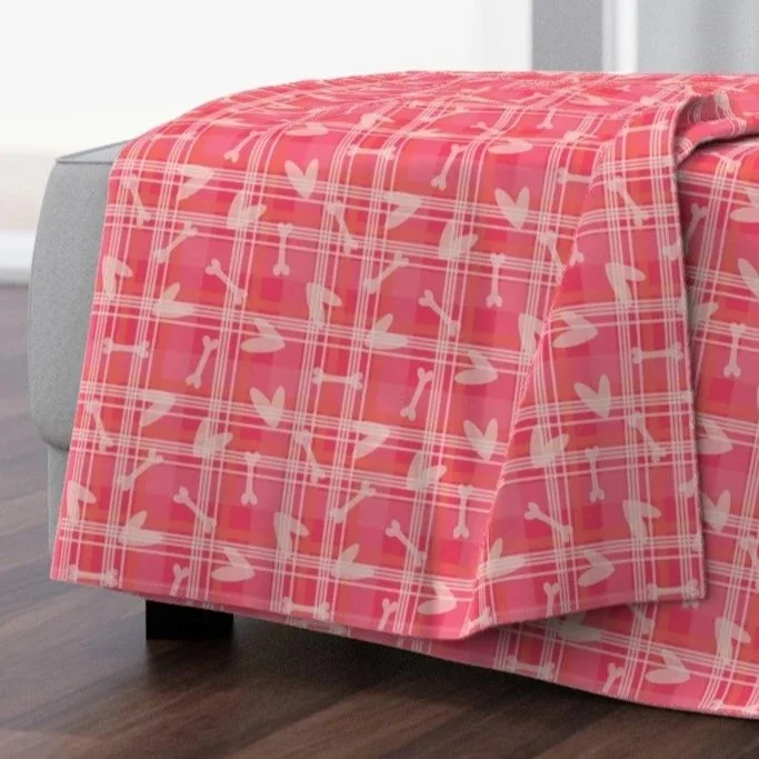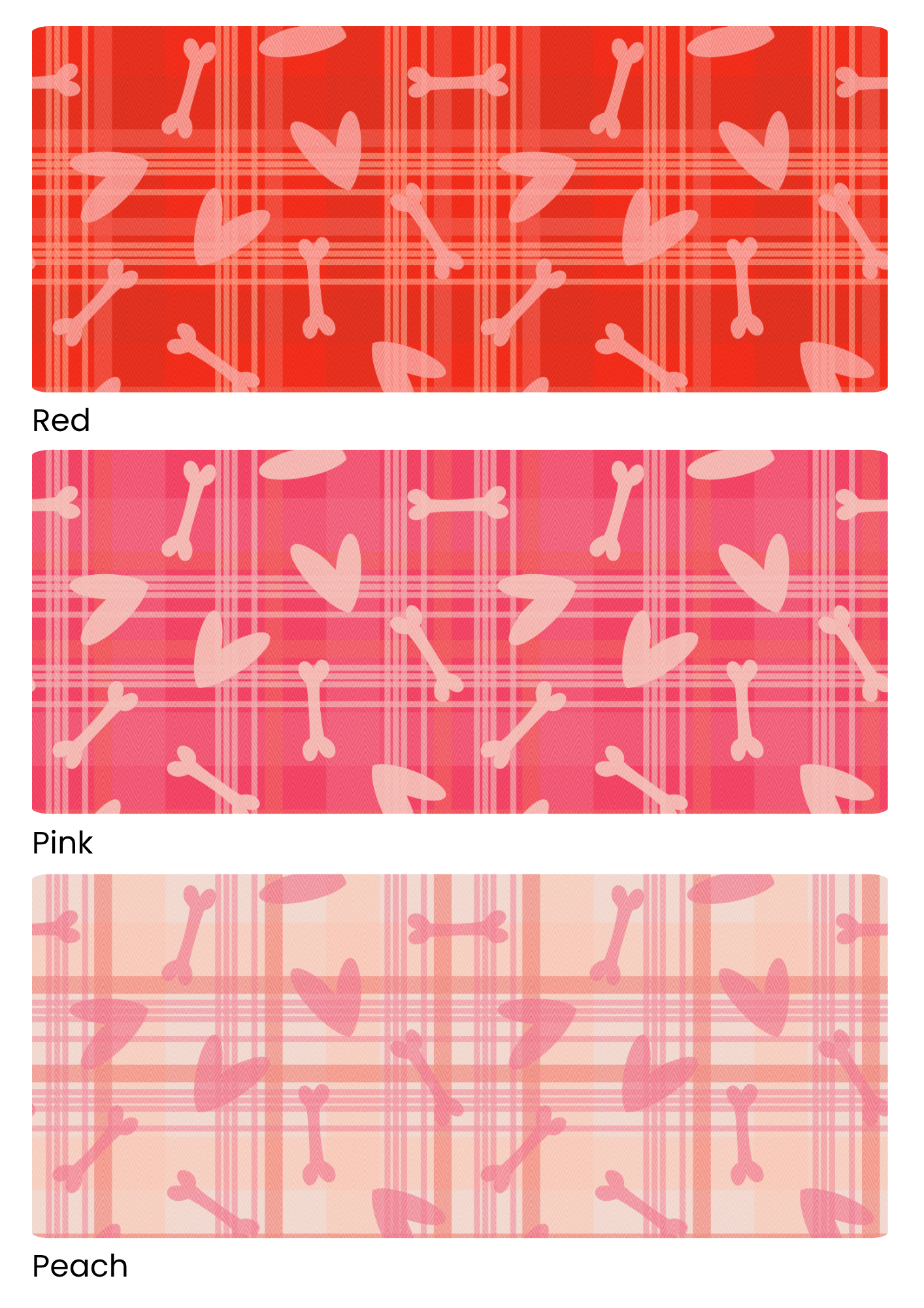 Celebrate your pet with this Valentine’s Day-ready pattern collection featuring playful hearts and bones scattered across cozy plaid backdrops. Designed in warm red, blush pink, and soft peach colorways, these prints are perfect for pet bandanas, accessories, and home décor.