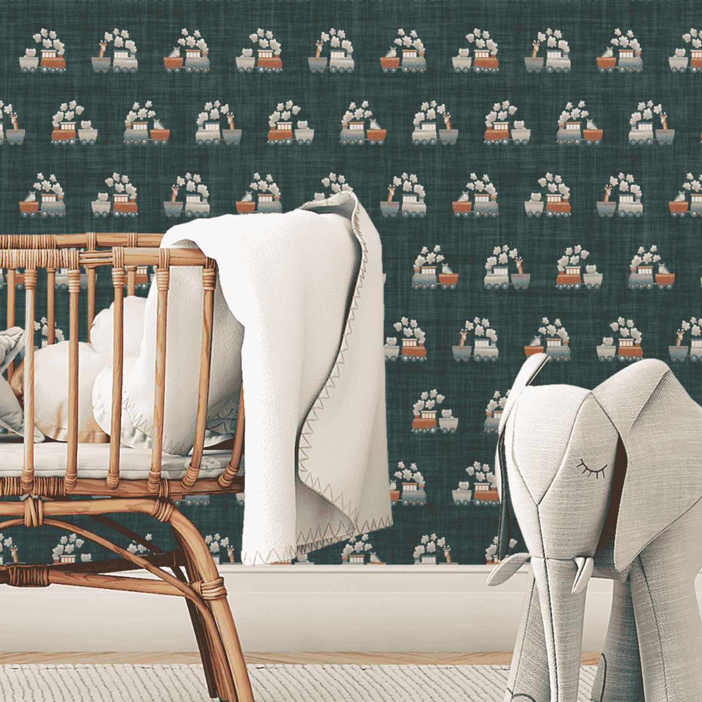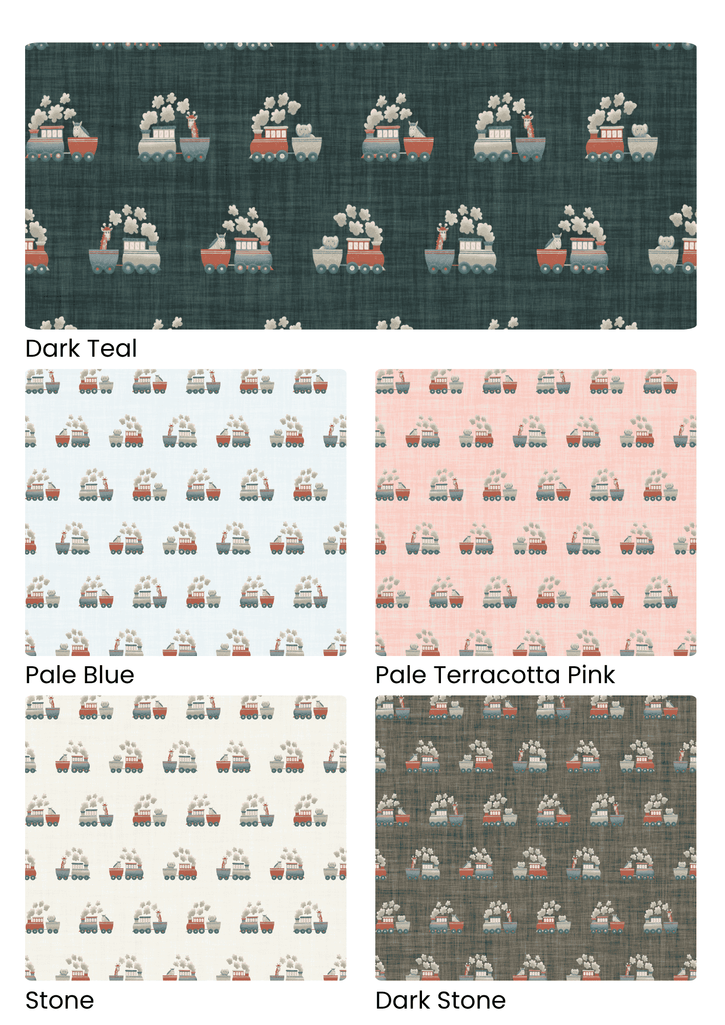 Steam Train Safari is a whimsical nursery pattern featuring a charming safari animal train with giraffes, elephants, and zebras riding along in illustrated carriages. This playful surface design captures the spirit of adventure and imagination—perfect for boys’ rooms, gender-neutral nurseries, and safari-themed baby décor.