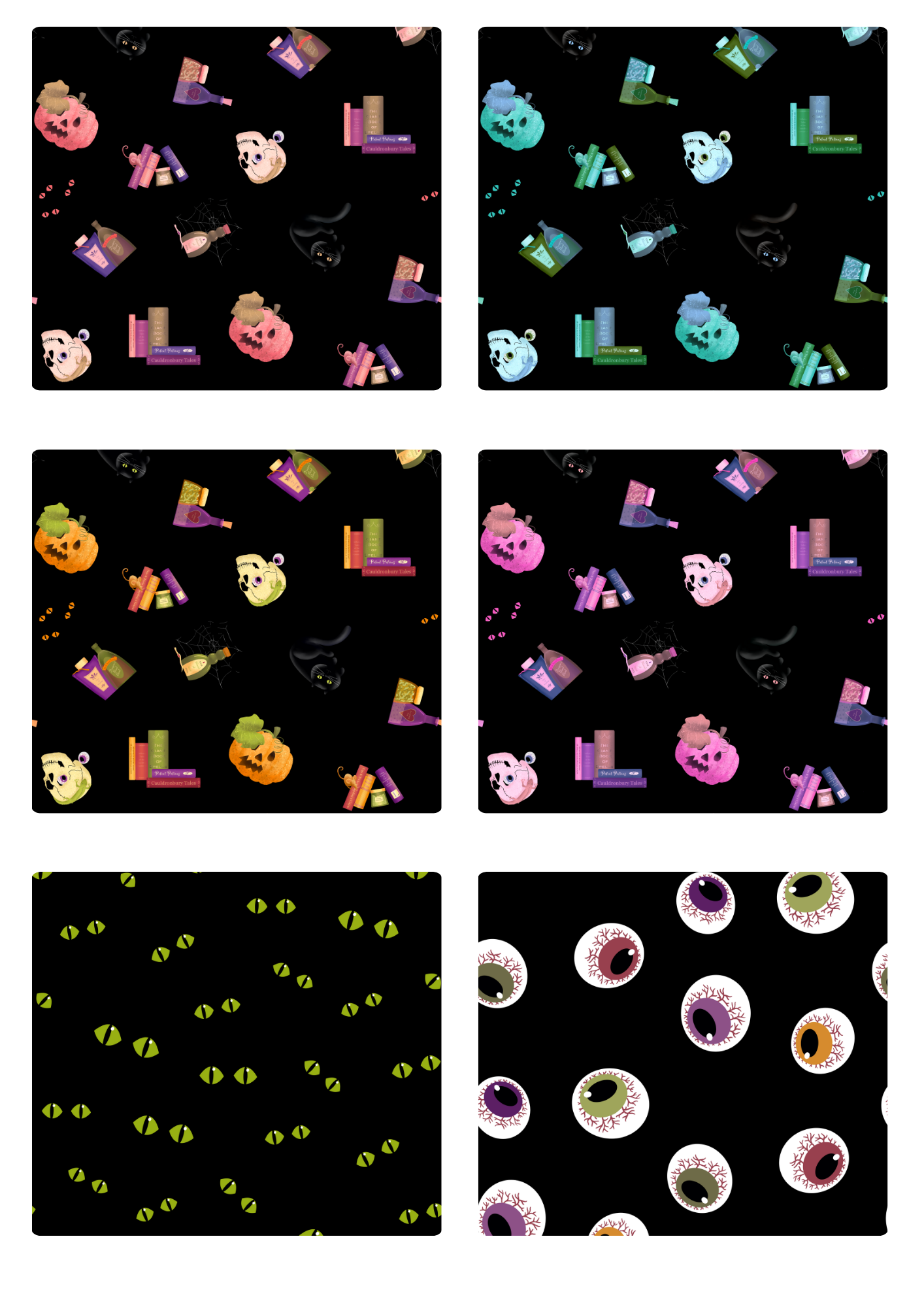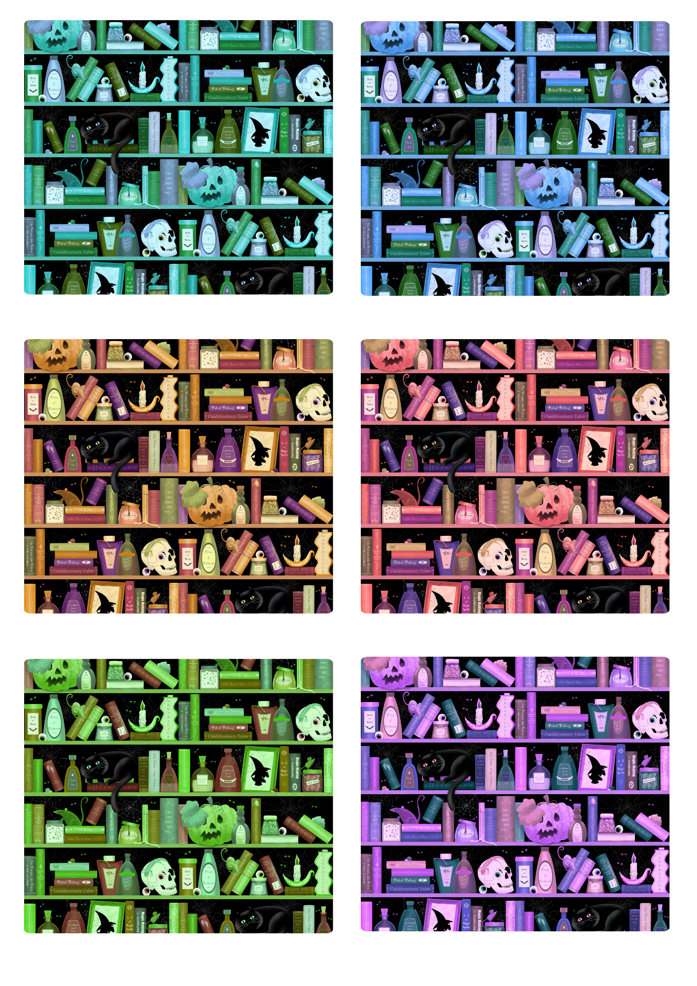 A playful yet eerie Halloween design featuring stacked spell books, glowing potions, skulls, jack-o’-lanterns, frogs, rats, and vintage silhouette witches’ portraits. Perfect for spooky season décor, themed apparel, and accessories with a magical twist. Rich colors pop against a black background, making it ideal for bold, festive projects.